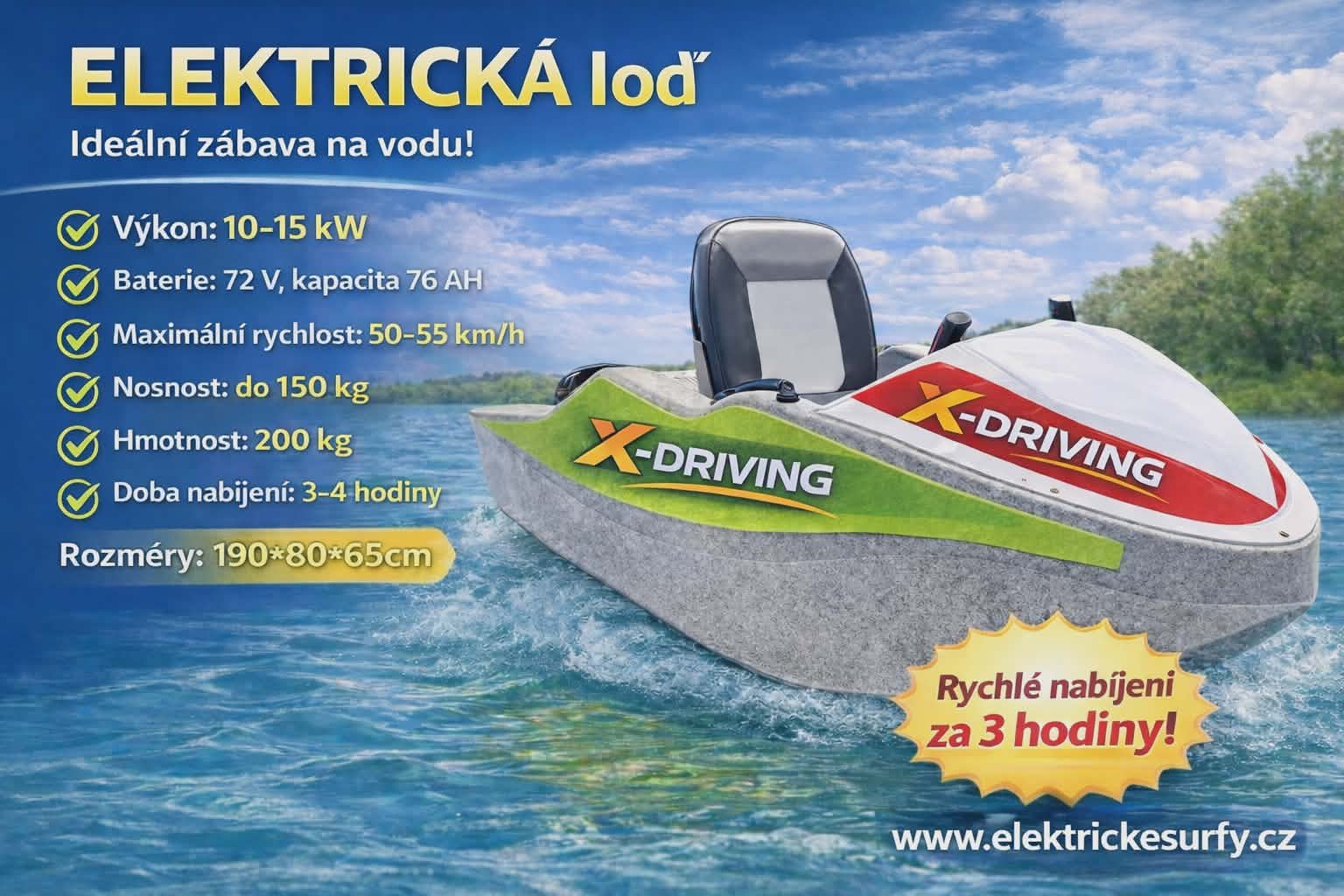 Výkon: 10-15 kWBaterie: 72 V, 76 AhMax. rychlost: 50-55 km/hNosnost: do 150 kgHmotnost: 200 kgDoba nabíjení: 3-4 hod.Rozměry: 190x80x65 cm